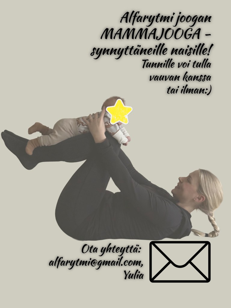 Miten jooga auttaa tätä palautumisen prosessia? Mammajooga-tunneilla harjoitellaan turvallisesti ja edetään hitaasti omaa kehoa kuunnellen. Jos on mahdollisuus tulla tunnille ilman vauvaa, niin se on naiselle myös oma hetki levätä ja hengittää.
